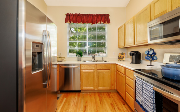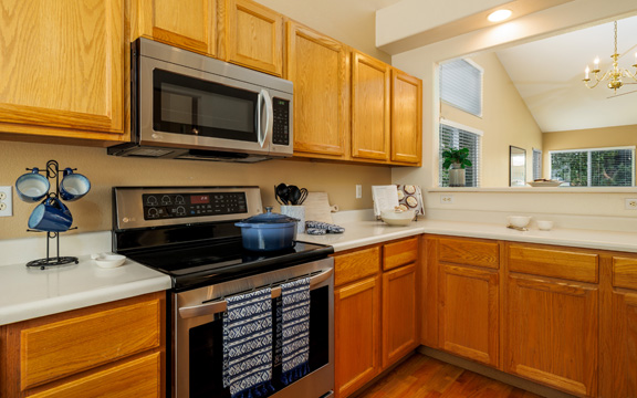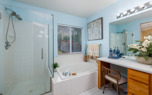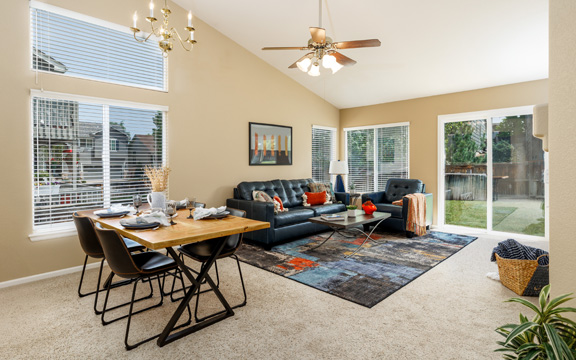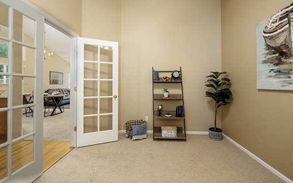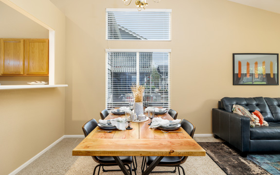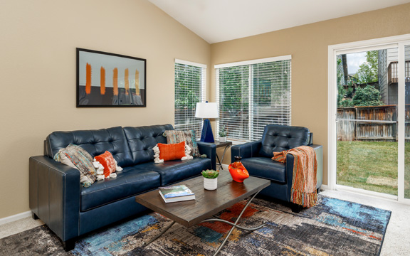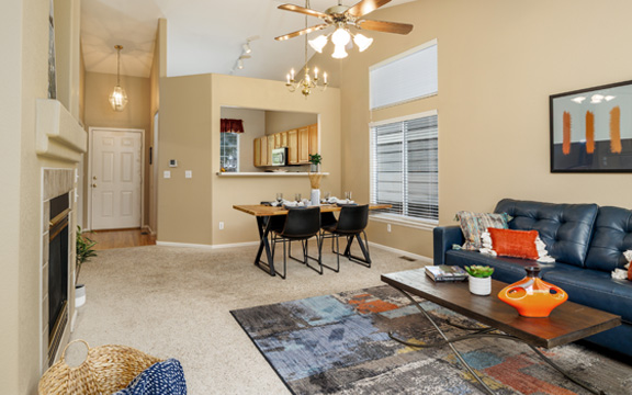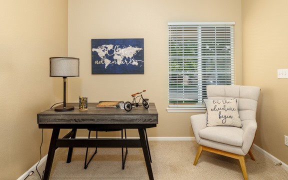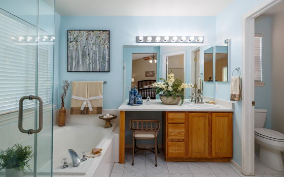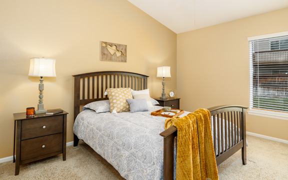 The interior gold walls presented a design challenge. We selected decor and furnishings in the living area that drew out the color of the walls and livened up the space. In the master bedroom we chose gold and grey tones to add an element of class and sophistication.